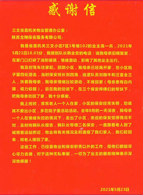 業(yè)主送來(lái)感謝信以表對(duì)小區(qū)全體保安的衷心感謝,面對(duì)業(yè)主的認(rèn)可,三爻小區(qū)的全體保安表示,守護(hù)每一位業(yè)主是我們龍翔保安的使命,我們將繼續(xù)盡心竭力、服務(wù)業(yè)主、守護(hù)業(yè)主,以真心、耐心、細(xì)心、愛(ài)心為每一位業(yè)主帶來(lái)安心與舒心的生活環(huán)境。