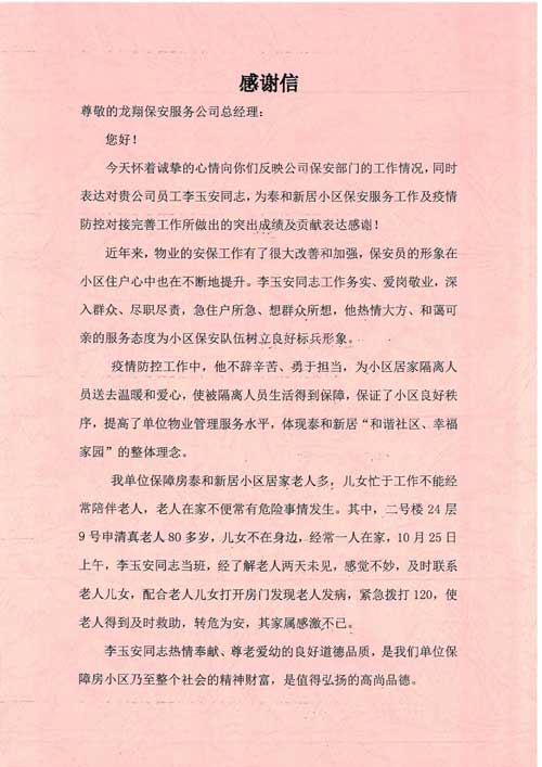 感謝信中特別表?yè)P(yáng)了龍翔保安的李玉安同志,李玉安自入職泰和新居項(xiàng)目以來(lái),工作認(rèn)真出色、恪盡職守、愛(ài)崗敬業(yè),平日安保服務(wù)工作中想群眾所想、急住戶所急,他熱情大方、和藹可親的服務(wù)態(tài)度獲得了廣大業(yè)主的一致認(rèn)可,同時(shí)也在保安隊(duì)伍中樹立了良好的標(biāo)兵形象。
