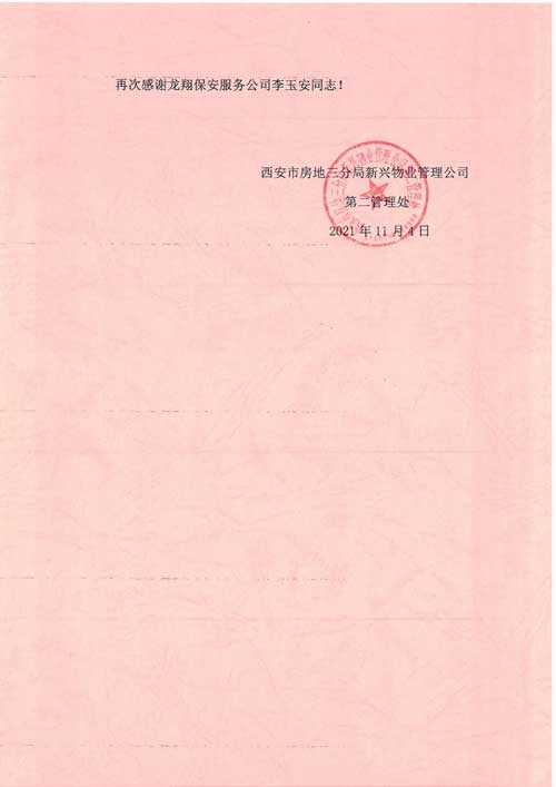 近日,陜西龍翔保安服務(wù)有限公司(簡(jiǎn)稱:龍翔保安)收到一封來(lái)自西安市房地三分局新興物業(yè)管理公司(第二管理處)的感謝信。