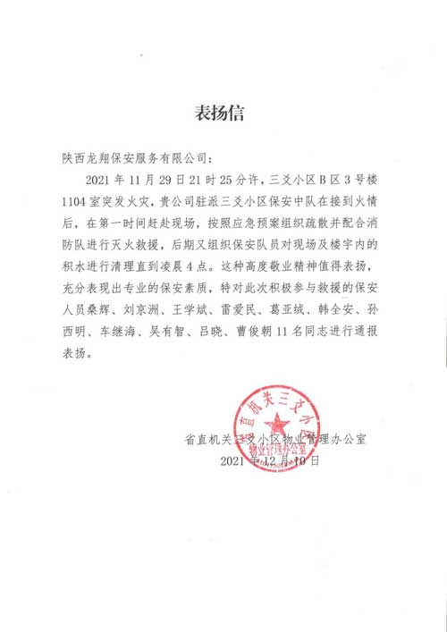 在本次火災(zāi)事故中,龍翔保安駐三爻小區(qū)中隊(duì)組織有序、處置得當(dāng)、救援及時(shí),未發(fā)生人員傷亡,得到了消防部門(mén)、小區(qū)物業(yè)辦的高度認(rèn)可。事后,省直機(jī)關(guān)三爻小區(qū)物業(yè)辦特別對(duì)參與救援的保安人員桑輝、劉京洲、王學(xué)斌、雷愛(ài)民、葛亞絨、韓全安、孫西明、車(chē)?yán)^海、吳有智、呂曉、曹俊朝11名同志進(jìn)行通報(bào)表?yè)P(yáng),并送來(lái)感謝信和先進(jìn)集體的錦旗,表達(dá)對(duì)保安服務(wù)工作的肯定。