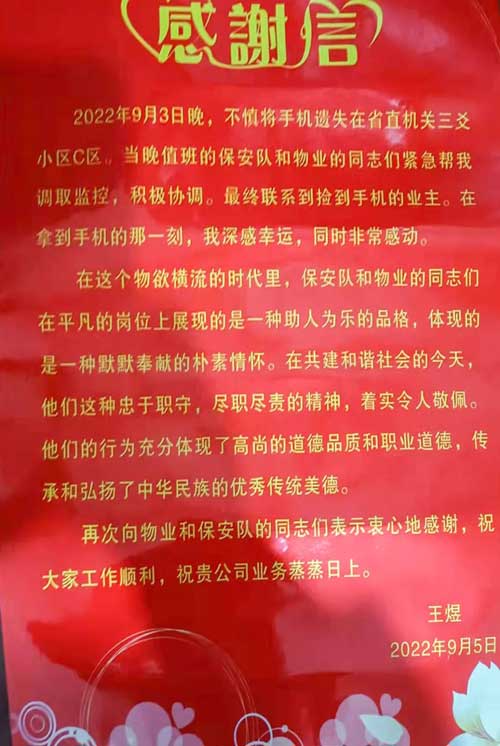9月5日下午,失主王師傅送來(lái)“保此處無(wú)驚無(wú)險(xiǎn),安眾心任勞任怨”的錦旗和一封感謝信,表達(dá)他們對(duì)龍翔保安的由衷謝意。
